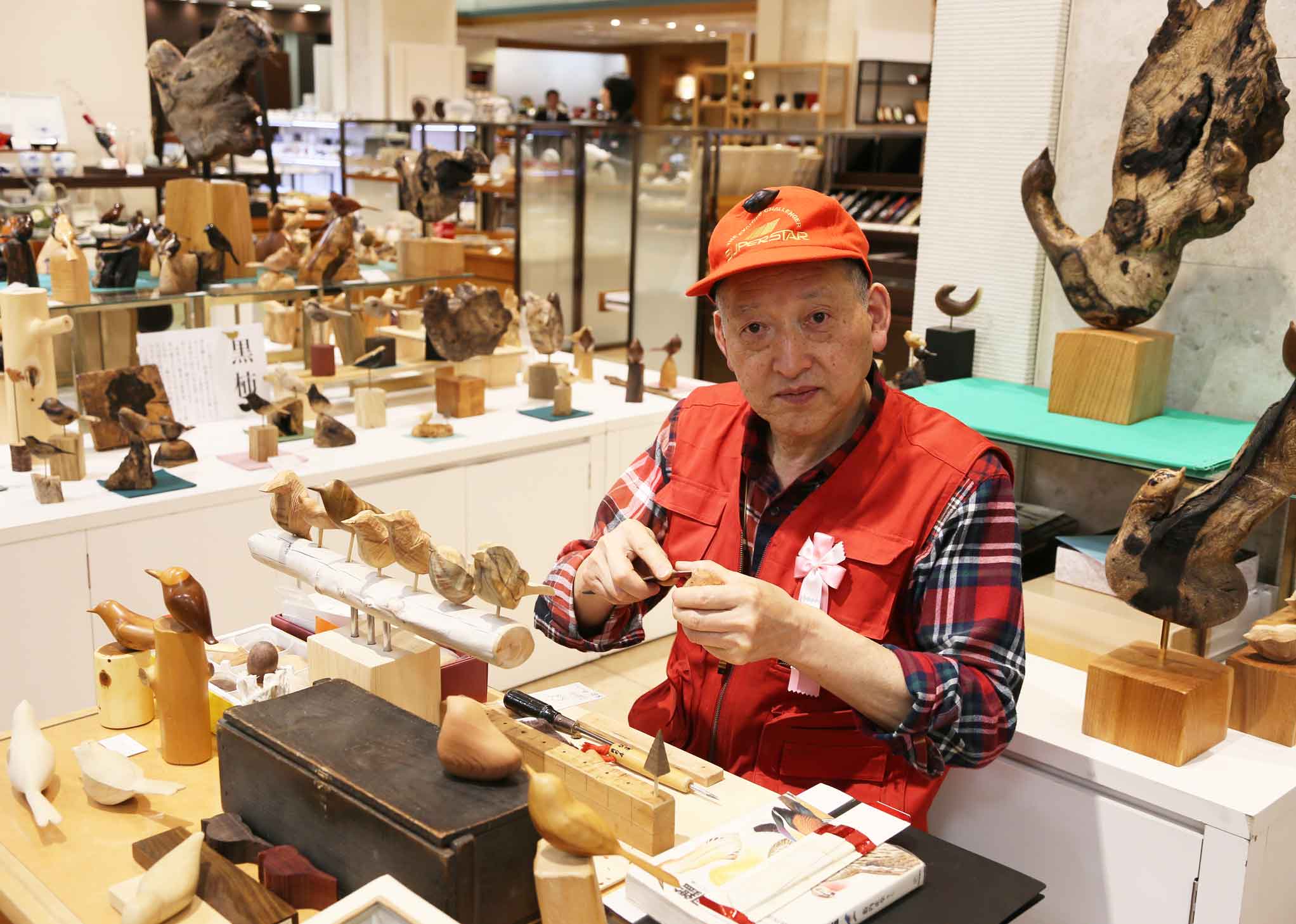 陶芸、木彫、石・木彫り、独楽、ステンドグラスなどさまざまなジャンルの作家が展示します。